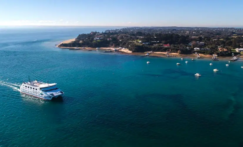 From the Docklands by the Yarra River in Melbourne, travel to Portarlington Pier aboard Port Phillip Ferry on a relaxing 90-minute journey, a scenic sail across Port Phillip Bay.